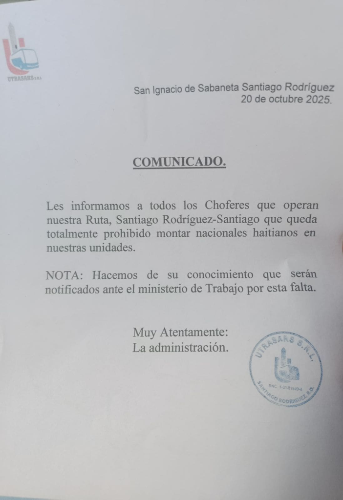 SANTIAGO.- Preocupación y debate social ha generado un comunicado emitido el 20 de octubre del 2025 por la empresa de transporte Utrasars SRL, en el que prohíbe a sus choferes transportar haitianos en la ruta que conecta a las provincias Santiago Rodríguez y Santiago.