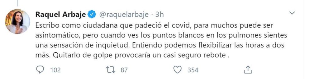 “Escribo como ciudadana que padeció el COVID-19, para muchos puede ser asintomático, pero cuando ves los puntos blancos en los pulmones sientes una sensación de inquietud. Entiendo podemos flexibilizar las horas a dos más. Quitarlo de golpe provocaría un casi seguro rebote” indicó Arbaje en su cuenta de Twitter.