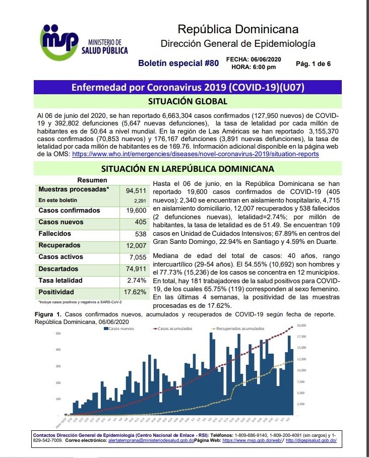 SANTO DOMINGO.- Los infectados por el coronavirus COVID-19 en la República Dominicana aumentaron a 19,600, tras registrarse 405 nuevos casos, mientras que los fallecidos totalizan 538, después de dos nuevas defunciones ayer, cuando se realizaron 2,291 pruebas, informó este domingo el Ministerio de Salud Pública.