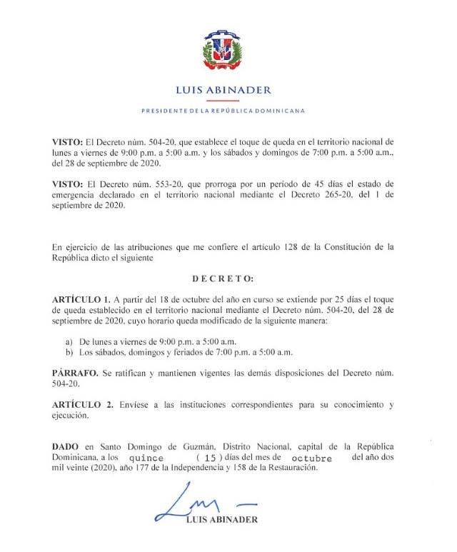 Se recuerda que el decreto 554-20 emitido por el Poder Ejecutivo el 16 de octubre del presente año indica que durante los sábados, domingos y feriados la citada disposición inicia de 7: 00 pm a 5:00 am.