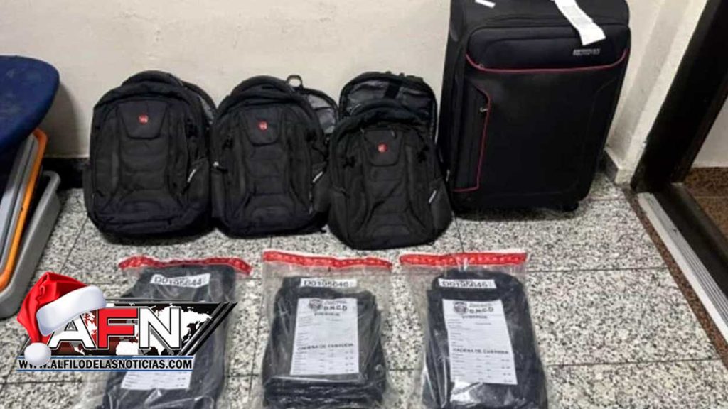 Por instrucciones del fiscal se procedió a abrir la maleta, en cuyo interior se ocuparon prendas de vestir y tres mochilas, con doble fondo conteniendo dentro las once láminas de la sustancia, con un peso superior a los nueve kilogramos, indica una nota de prensa de la DNCD.