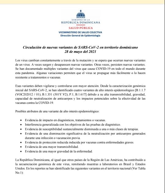 SANTO DOMINGO. -El Ministerio de Salud Pública alertó este sábado sobre la circulación de dos variante de SARS-CoV-2 en el país.