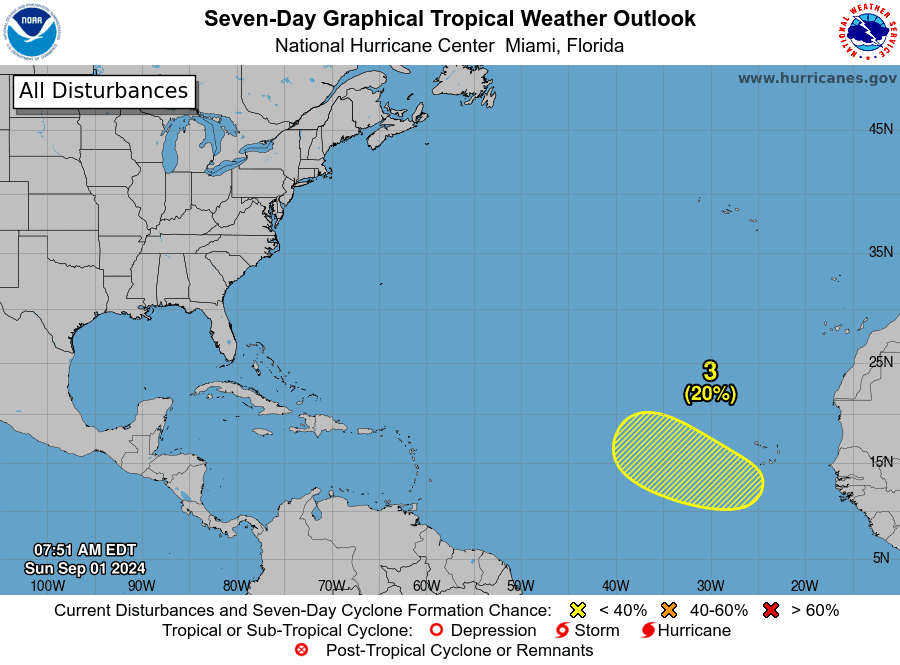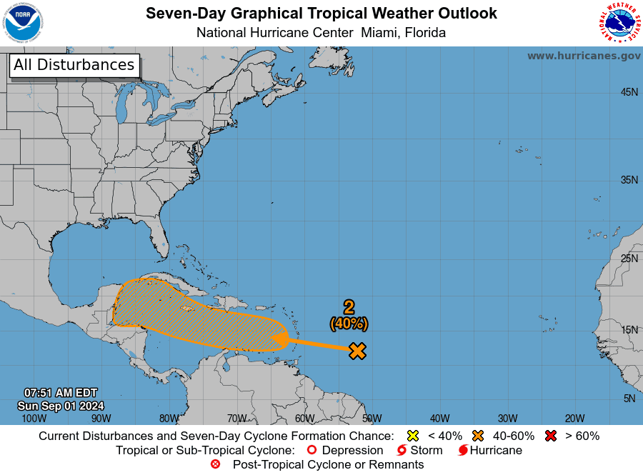 Sobre los dos sistemas que son vigilados, el primero de estos y más cercano es que está a varios cientos de kilómetros al este de las Antillas Menores y aunque ha cambiado poco desde ayer, presenta un potencial medio de convertirse en ciclón tropical en siete días con un 40 % y bajo en 48 horas con 0 %.