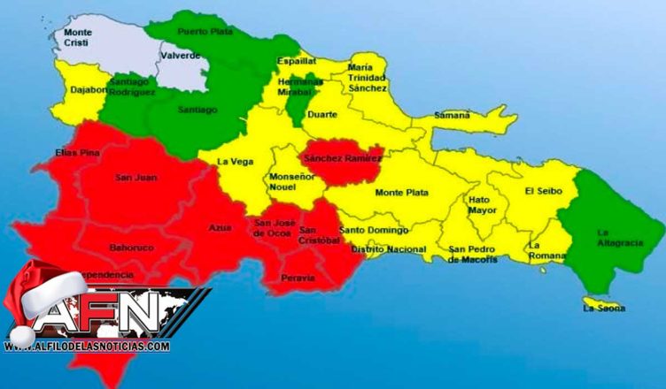 El COE colocó en alerta roja a San Cristóbal, Peravia y Sánchez Ramírez, las cuales estaban en amarilla adicional a Barahona, San José de Ocoa, Independencia, San Cristóbal, Sánchez Ramírez, San Juan, Azua, Bahoruco, Elías Piña, Peravia, para un total de 14.