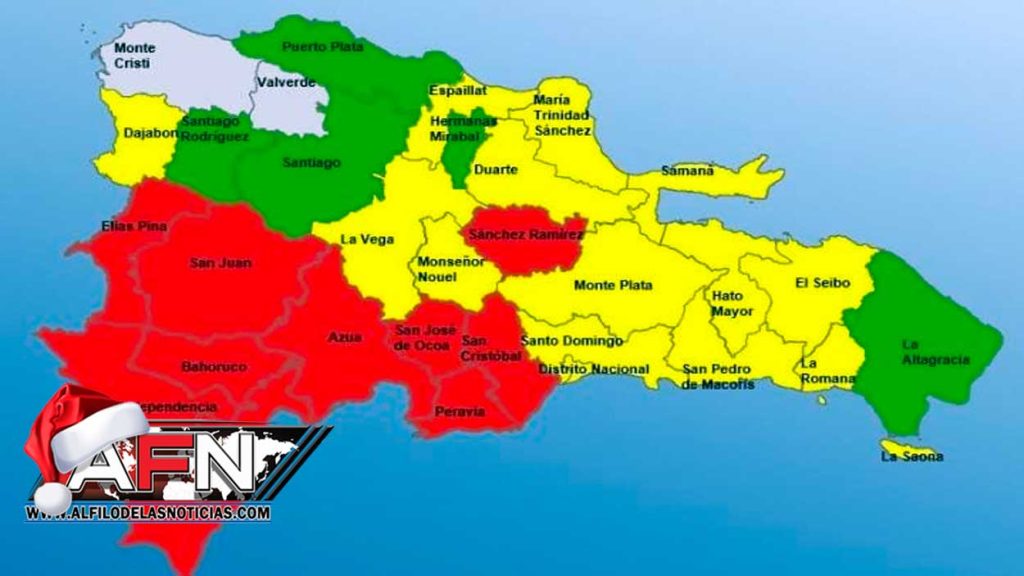 El COE colocó en alerta roja a San Cristóbal, Peravia y Sánchez Ramírez, las cuales estaban en amarilla adicional a Barahona, San José de Ocoa, Independencia, San Cristóbal, Sánchez Ramírez, San Juan, Azua, Bahoruco, Elías Piña, Peravia, para un total de 14.
