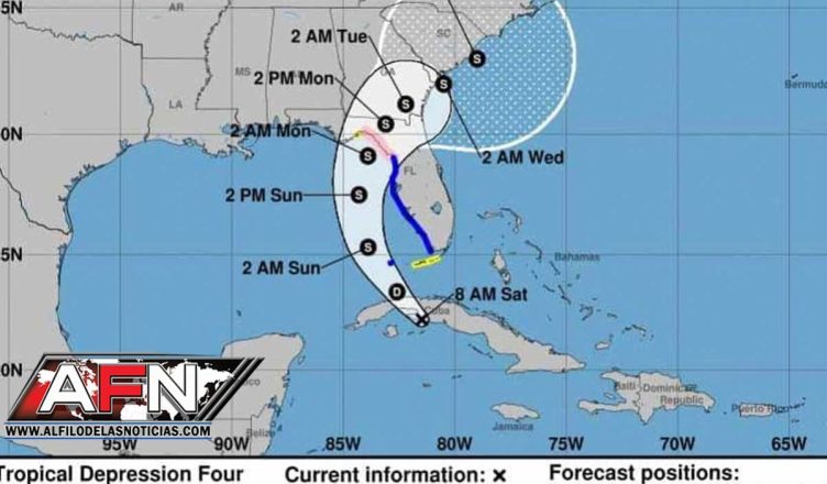 EEUU.- El Centro Nacional de Huracanes (NHC) informó este sábado sobre la formación de la depresión tropical número 4, ubicada cerca de la latitud 22.2 Norte y longitud 81.5 Oeste.