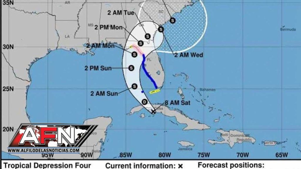 EEUU.- El Centro Nacional de Huracanes (NHC) informó este sábado sobre la formación de la depresión tropical número 4, ubicada cerca de la latitud 22.2 Norte y longitud 81.5 Oeste.