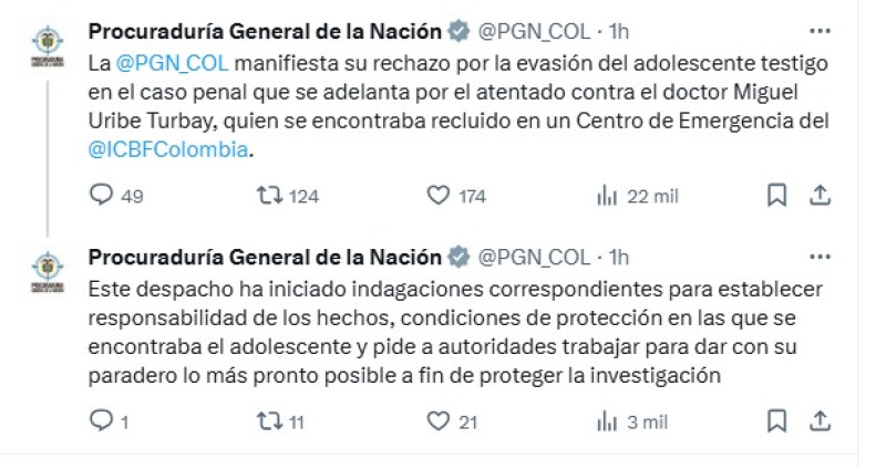 COLOMBIA.- En las últimas horas, las autoridades registraron que el joven de 17 años, que se había entregado por su vínculo con el atentado sicarial a Miguel Uribe Turbay, se fugó del centro especial en Bogotá en el que estaba bajo custodia. La Procuraduría General de la Nación expresó su rechazo ante esa situación, solicitó la adopción de medidas urgentes y anunció investigaciones.