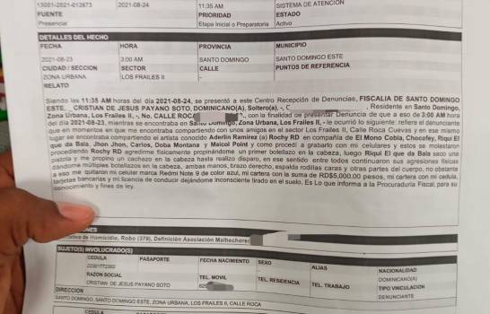 La víctima dice que luego uno de los acompañantes del cantante, identificado como “Riky el que da bala”, sacó un arma de fuego y lo agredió con un cachazo también en la cabeza y a seguidas comenzó a atacarlo el grupo entero.