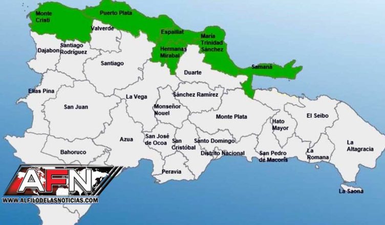Las provincias en alerta verde son: Montecristi, Samaná, Puerto Plata, Espaillat, Hermanas Mirabal y María Trinidad Sánchez.