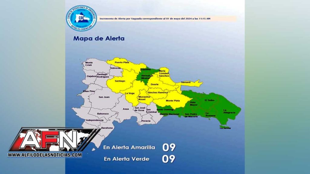 Mientras que en alerta verde están el Distrito Nacional, Santo Domingo, Hermanas Mirabal, Espaillat, El Seibo, La Romana, La Altagracia, San Pedro de Macorís y Hato Mayor.