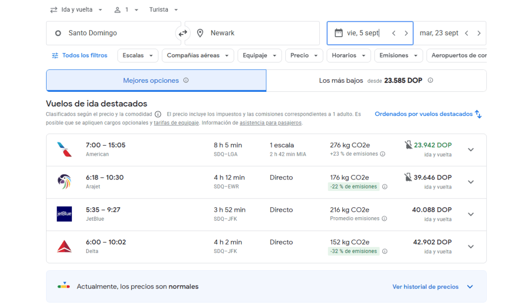 - American Airlines vende pasajes en RD$ 24,600, aunque con escala, ya que no opera vuelos directos hacia Nueva York desde República Dominicana.