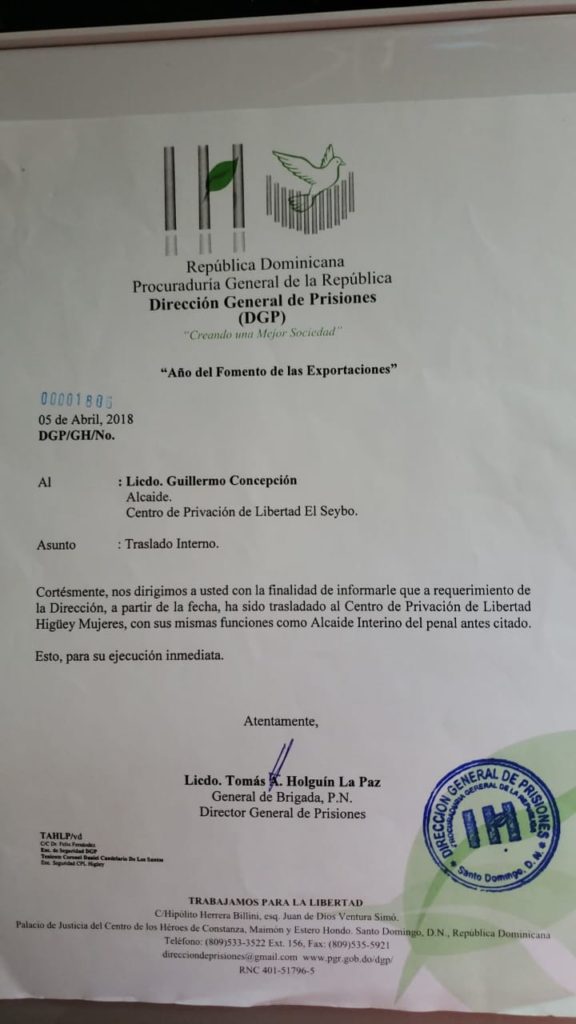 SANTO DOMINGO.- El alcaide de la cárcel de mujeres de Anamuya, en Higüey, Guillermo Concepción, está suspendido de sus funciones por violar el protocolo de traslado de una interna, después de que una comunicadora denunciara este jueves el hecho y publicara fotos de esa salida irregular.
