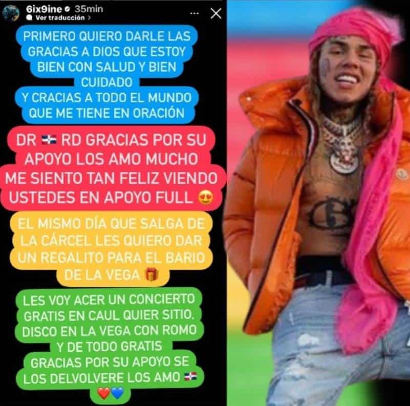 LA VEGA.- «Primero quiero darle las gracias a Dios, estoy bien con salud y bien cuidado. Gracias a todo el mundo que me tiene en oración. República Dominicana, gracias por su apoyo, los amo mucho. Me siento tan feliz viendo (a) ustedes en apoyo ‘full’ (completo)». Este es parte del mensaje con el que Tekashi 6ix9ine reapareció en redes sociales tras su arresto en República Dominicana, donde se encuentra recluido en una cárcel.