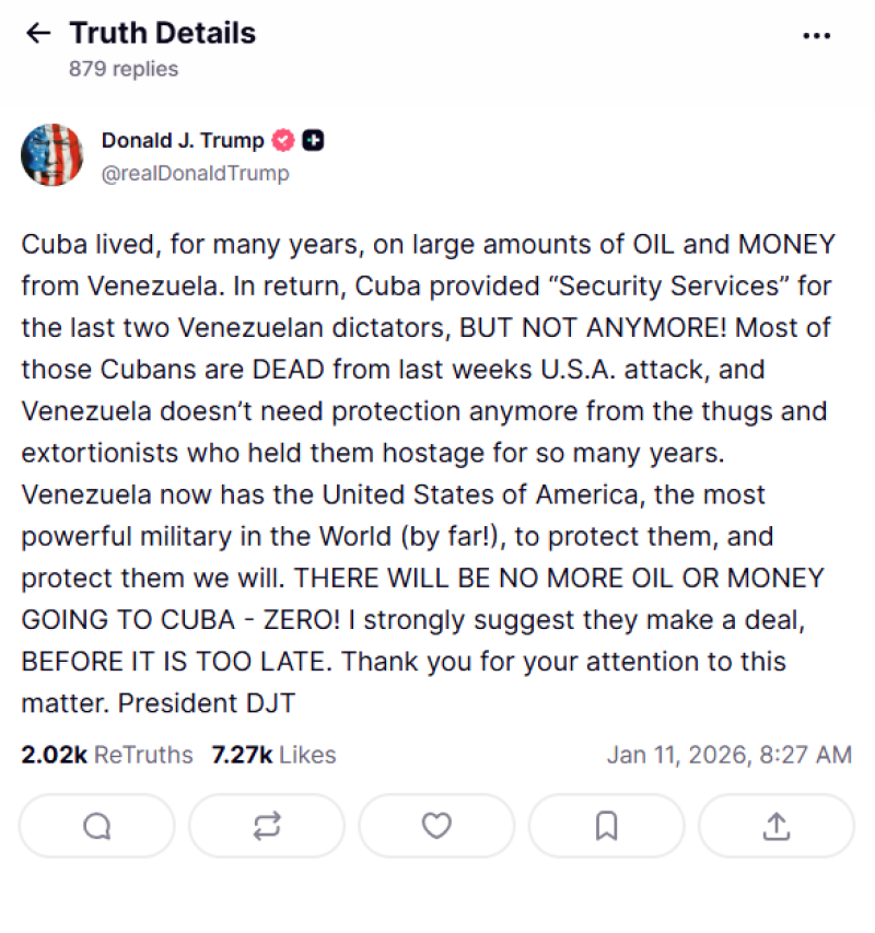 En su propia publicación poco después, Trump dijo que «Cuba vivió, durante muchos años, de grandes cantidades de PETRÓLEO y DINERO provenientes de Venezuela. A cambio, Cuba proporcionó ‘Servicios de Seguridad’ a los dos últimos dictadores venezolanos, ¡PERO YA NO MÁS!».