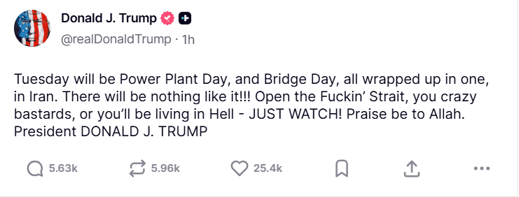«El martes será el Día de la Central Eléctrica y el Día del Puente, todo en uno, en Irán. ¡No habrá nada igual!!!», escribió Trump en un su red social, Truth Social.