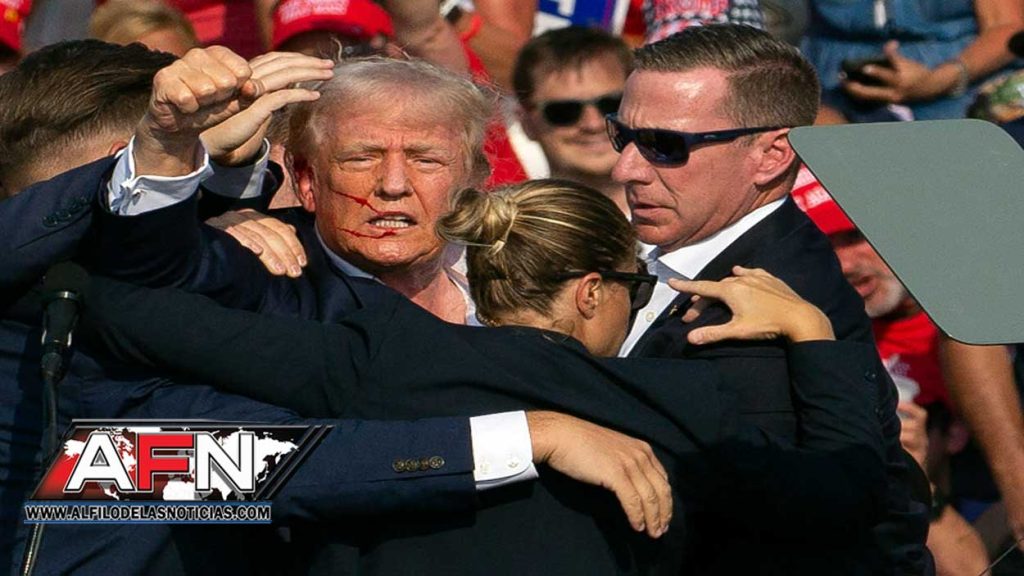 El expresidente y virtual candidato republicano a la presidencia Donald Trump es custodiado por agentes del Servicio Secreto de Estados Unidos en un acto de campaña, el sábado 13 de julio de 2024, en Butler, Pensilvania. (AP Foto/Evan Vucci)