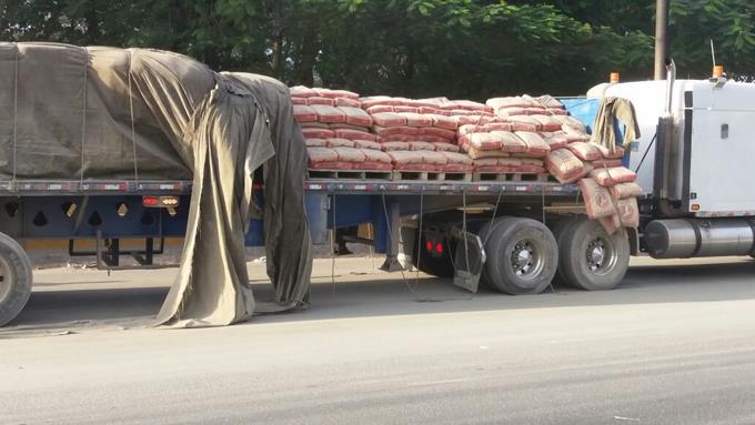 Aparentemente la caída de la mercancía se debió a que se soltaron las sogas que sostienen la lona que cubría las fundas de cemento.