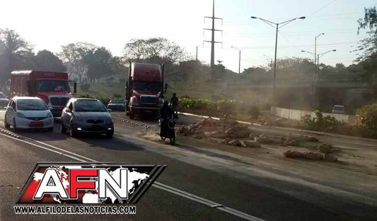 Al percatarse de la situación, el conductor del camión y su ayudante se detuvieron a recoger el material caído de su vehículo, ante el taponamiento que se produjo.