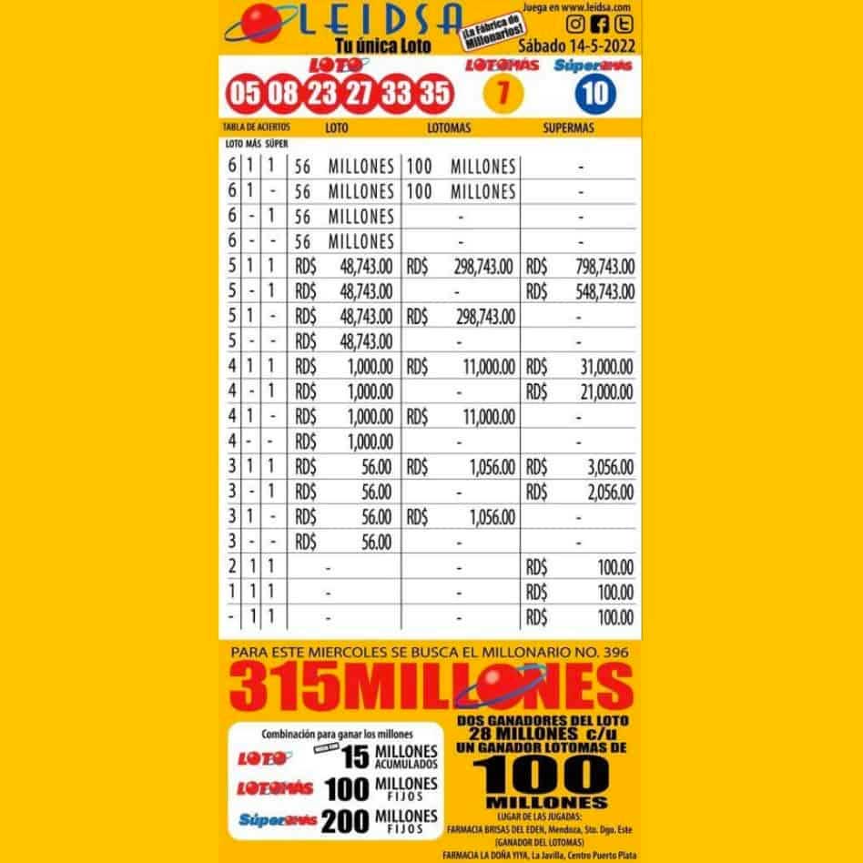 La Lotería Electrónica Internacional Dominicana (Leidsa) informó este domingo que en el sorteo correspondiente al sábado 14 de mayo de este 2022, resultaron dos tickets ganadores, uno del Loto y otro al Lotomás.