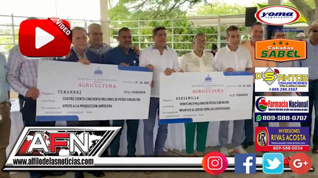 SAN FRANCISCO DE MACORÍS.– En un acto encabezado por el ministro de Agricultura, Limber Cruz, el gobierno entregó un cheque por cuatro cientos cincuenta millones de pesos a la Federación Nacional de Arroz (FENARROZ) para el apoyo de la aproducción arrocera en la provincia Duarte.