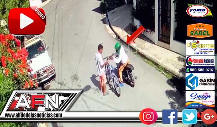 SAN FRANCISCO DE MACORIS.- Una cámara de seguridad captó el momento en que un adolescente es despojado de su teléfono celular a plena luz del día por un motociclista.