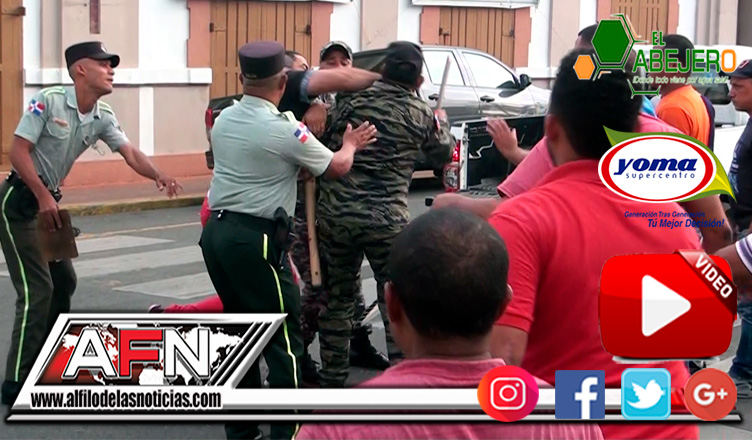 SAN FRANCISCO DE MACORÍS. – Un video muestra el momento que un coronel de la Policía Nacional recibe una fuerte “trompada” en medio de una protesta organizada por choferes frente al ayuntamiento de este municipio.